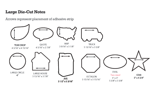 Product Info : Superior, precision die-cuts. Ultra-repositionable adhesive. Available in a variety of shapes and sizes. Have your logo and message imprinted in digital 4-color process. Available in Ultra-White, yellow, green, blue, ivory or gray paper. New neon colors! Bright orange, bright green, bright pink and bright yellow. Call for details. Also, we have an eco option of white 100% Post-Consumer Recycled paper for an additional price. Call us for details. Made in the USA.